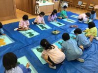 筆を使ってトンボの体の色とコスモスを描きました。その後はカエルを描くことに挑戦しました。大きさや、手足の数を確認しながら丁寧に描きました。今にも飛び出しそうな絵になっていました。
