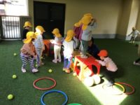 今日はピロティに行き遊びました。最初「まてまてごっこ」をしてからカラーボックスやフープを使って遊びました。カラーボックスからジャンプしたり、ボールを蹴ったり投げたりしているお友達もいましたよ。シャボン玉を追いかけて遊び、両手をパチンと叩いて遊んでいました。