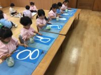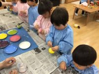 今日は地震後に火災が起きた時の避難訓練がありました。防災頭巾を被りお部屋中央に集まってからピロティへ避難することができました。防災頭巾を被るのが難し少し時間がかかりました。こま製作では、綿棒を使って模様を描いて楽しみました。