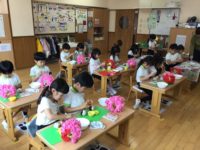 ひまわりさん2回目の体操教室がありました。「よーいどん」でまっすぐに走ったり、ケンケンに挑戦してみたり、体操のりゅうじ先生と一緒に楽しく体を動かしました。製作では、クレパスを使って、頑張っておひなさまのお顔を描きました。