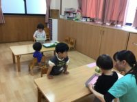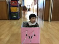 今日はお休みが多かったので、いろいろな遊びをしながらゆっくり過ごしました。積み木を積み上げたり、玉を動かすおもちゃでは集中して遊ぶことができました。その後は、保育者と手を繋いで歩いたり、段ボール車に乗ってお散歩もしました。