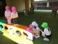 今日はピロティで遊びました。すみれ組さんが作った足のトンネルにボールを転がしたり、並べたフラフープを一緒に飛んだりと、今日もたくさん遊んでもらいました。給食後のお着替えは、本当は自分でできることも「手伝って」とすみれ組さんにちょっぴり甘えるたんぽぽ組さんでした。