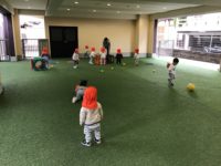 保育者に「待て待て〜!」と追いかけられると嬉しそうに走り出すもも組さんです。たくさん追いかけっこをした後はボールやフープ・カラーボックスなどのおもちゃを出して好きな遊びを見つけてしっかりと体を動かすことができました。