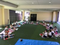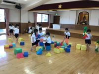 今日はお部屋で新しいゲームを何個かしました。その後はホールに行き、鉄棒や跳び箱、おもちゃを使いたくさん体を動かして遊びました。そしてお弁当は3階テラスで食べました。「暑いー」と言いながらもピクニック気分を味わいました。