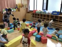 マットの山・すべり台などを出して運動遊びを楽しむことができました。保育者の声かけに反応して一緒に体を動かしました。大きめのトンネルも出すと興味を持って顔をのぞかせたりくぐったりして遊びました!とっても活発的に動くもも組さんです。