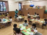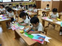 今日は昨日のこいのぼり製作の続きをしました。はじめに絵の具の筆のお約束を教えてもらいました。クレパスで描いた模様の上から好きな色を選び進め、みんな尾っぽの先まで丁寧に塗り集中していました。今日できなかったお友達は後日やる予定です。