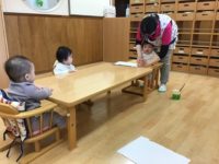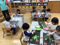 このぼりの台紙にシールを貼りました。こうのぼりの台紙を見せるとみんな興味津々で、目の周りに貼ったり、いろいろな色のシールを選んだり、自分でシールの台紙剥がしたりして、思い思いに一生懸命貼ってくれていました。