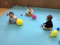 ピロティに出て遊びました。はじめは別々に活動していた進級園児さん、新入園児さんでしたが、気がつけば一緒に遊べる日も増えてきています。交流する姿も見られ、思い思いにボールやカラーボックスで楽しんでいました。