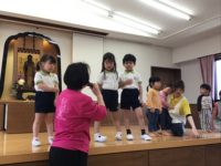4月のお誕生会に参加しました。たんぽぽ組になったので、椅子に座っての参加です。仏讃の歌に不思議そうにしながらも、お辞儀を一緒にしたり、お友だちが舞台に立つと、拍手をしてくれたりして、お誕生会の雰囲気を楽しみました。出し物では、動物や食べ物が出てきて喜んでいました。