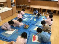 2グループに分かれて活動しました。鯉のぼり製作では膨らませたビニール袋に絵の具を付けて模様にしたり、絵の具を伸ばしたりと好きな柄にしました。戸外遊びグループは途中ですみれ組さんと一緒に砂場で遊びました。