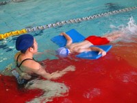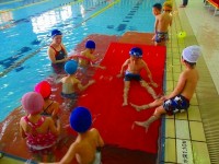 今年も水遊びの季節が来ました。5歳児はスイミングスクールのプールで指導を受けています。