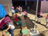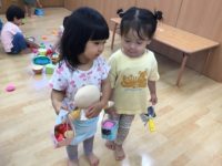 今日は運動会に向けてワイワイ運動会の体操とかけっこの練習をしました。大きな声で「はい」とお返事できるようになってきました。その後、お部屋でおままごとをして遊びました。小さなカバンを持ってお買い物に出かけたり、赤ちゃんのお世話をしたりして遊んでいましたよ。