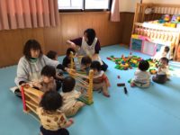 追視のおもちゃやブロックを出してじっくりと集中して遊ぶことができました。ブロックを積み重ねて完成した物をとても嬉しそうに保育者に見せてくれたりできないことがあると表情や仕草で伝えて教えてくれたりします。今年も保育のご協力ありがとうございました。来年もよろしくお願いいたします。