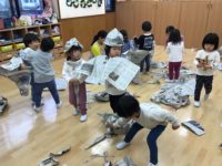 今日はフェスティバルに向けてカスタネットやお遊戯の練習をしました。カスタネットは青色の部分を叩いて歌に合わせながら鳴らしています。今日は曲が始まるまでは鳴らさないことや、前にいる保育者を見て真似をして鳴らす練習をしました。後半は新聞紙で遊びました。