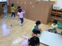 今日はロッカーと椅子を雑巾で拭いて大掃除をしました。その後、以前色塗りをしたこまを回してみました。また、カラーボールを使ってバイキンマンの的に当てたり、トンネルに潜らせたりして遊びましたよ。今年1年間ご協力ありがとうございました。