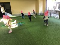 寒い朝でしたが、元気にピロティを走りまわりました。フープを持って電車や車になりきったり、「せんせー!待て待てしてー!」と鬼ごっこに参加したり。身体がホカホカするくらい、保育者も走りましたよ!今年もたくさんお世話になりありがとうございました。