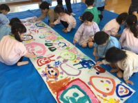 今日は初めての絵画教室がありました。大きな模造紙に絵の具で顔を描きました。自分の顔を描く子やライオンなどの動物の顔を描いている子がいました。その周りにはたくさんのお花を描いてとてもカラフルで素敵な絵が完成しました。廊下に貼ってるので見てみてください。