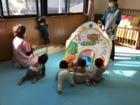 昨日の続きで、今日はおひなさまやお内裏さまの目のシールを貼り、出来上がるととても嬉しそうに眺めていました。順番に待っている間はお家テントやすべり台などを出して思いっきり体を動かして遊ぶことができました!