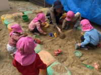 保育者と協力して山を作りトンネルを掘ったり、魚やドーナツ型に砂を入れて型抜きを楽しんだり、雨が降る前にたくさんあそぶことができました!すみれ組さんが育てているチューリップにも興味津々で大きく育った葉を観察するお友だちもいましたよ。