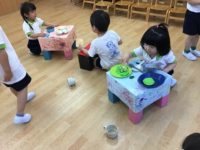 今日はすみれ組になり始めての席替えをしまし、その後は砂場で遊びました。八角ジムで遊ぶ子や砂場で落とし穴やアイスを作って楽しんでいました。