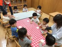 今日の音楽遊びは、リズム打ちをたくさんしました。手やタンバリンをリズムにのって叩いたり、みんなの前で太鼓のように叩いたりして楽しみました。はらぺこあおむしやリトミックもして盛りだくさんで、時間いっぱいまでできるようになりました。