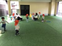 今日は、ピロティで遊びました。フープの電車に乗って走ったり、フープを両手で持って歩いていました。サッカーボールを蹴りながら走っている子もいました。カラーボックスの上に保育者に上がらせてもらい一緒にジャンプしたり自分でジャンプしてとっても嬉しそうでした。