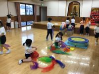 今日は、室内でブロックなどをして遊んだ後、来年度に向けて献灯献花の練習をしました。そのあとは、ホールで自由に遊びました。保育者が用意したフラフープや、しっぽ取りの布、デカパンを使って、お友達とどう使うか相談しながら遊びました。