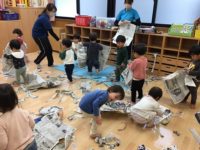 今日は盛りだくさんの活動でした。なぐり描きはすみれ組さんの卒園プレゼントになります。久しぶりの紙あそびではちぎって投げて紙吹雪を楽しんだり、広げた新聞紙をかぶって隠れたり、新聞紙で服やマントを作って羽織ったりと、嬉しそうでした。