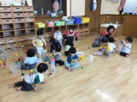 今日から2名新しいお友達が入園され、3名で機嫌よく過ごすことができました。音の鳴るおもちゃに興味を持って鳴らしたり叩いたりして遊ぶことができましたよ♪一人立ちハイハイ寝返りなどをして活発的に体を動かしていました。