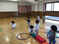 ホールで遊びました。今日はボール、フープのほかに、階段の道をつくって歩きました。「きいろからだよ」と、一方通行を教えると、分かってくれるお友だちもいました。ボールのシャワーは何度やっても大盛り上がりで、手を叩いたり、大きな声を出したりして喜んでくれました。