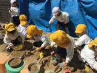 今日はピロティと砂場の好きな方を自分たちで選んで遊びました。ピロティではカラ一ボックスの上からジャンプしたり手押し車を走らせたり砂場ではカップを使いお店ごっこをしたりプランターの下のだんご虫を探して遊びました。