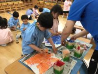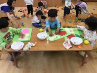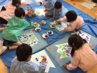 2グループに分かれて活動しました。鯉のぼり製作では膨らませたビニール袋に絵の具を付けて模様にしたり、絵の具を伸ばしたりと好きな柄にしました。戸外遊びグループは途中ですみれ組さんと一緒に砂場で遊びました。