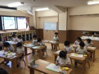 今日は折り紙でたんぽぽを折りました。折り紙の後は時間をかけて丁寧にお絵描きをしていました。本堂前では縄跳びをしたり、「郵便屋さん」の大縄に挑戦したり、葉っぱや虫の観察などをし楽しんでいました。
