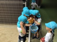 今日の砂場では、お花を植える為の準備で、草抜きをしていると、土の中から変わった虫や幼虫を発見し、観察に夢中になる姿もありました。バケツいっぱいに草を集めたり、ピロティで「郵便屋さん」の縄跳びに挑戦したりしました。