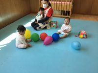 保育者が風船を上に上げると目で追いかけたり一緒にポンポン叩いて遊んだりしました。中には風船が怖いと感じて泣き出してしまうお友達がいたり転がった風船を追いかけたりと反応がさまざまでしたよ!その後は仕掛けおもちゃや小さいトンネルを出して保育者を一緒に遊びました。