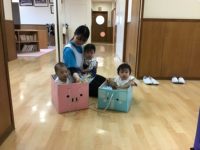 ピロティに出て遊びました。フープやボールのほかに、カラーボックスをつなげて出しました。シャボン玉を追いかけたり、カラービックスのトンネルをくぐったりジャンプしたりして、活発に体を動かして遊びました。