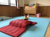 マットの山・すべり台などを出して運動遊びを楽しむことができました。保育者の声かけに反応して一緒に体を動かしました。大きめのトンネルも出すと興味を持って顔をのぞかせたりくぐったりして遊びました!とっても活発的に動くもも組さんです。