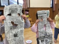 本日は体操で音楽に合わせてたくさん体を動かした後、新聞紙遊びをしました。ちぎったり、丸めたり、お洋服や料理に変身したりと色々なものに見立てて遊ぶ子どもたちでした!音の違いにも大興奮する姿が見られましたよ!