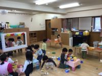 抱っこやダンボール電車に乗って園内をお散歩しました。周りの様子をキョロキョロしながら見ていましたよ。園文庫の大きな窓につかまり立ちをして外の景色をじっくりと眺めるもも組さん!その後はお部屋に戻り仕掛けおもちゃなどで好きなおもちゃを見つけて遊びました。